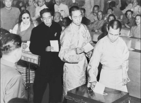 In this September 1954 picture, the two spiritual leaders of Tibet, the rival Panchen (C) and Dalai Lamas (R), both Tibet's MP, are shown casting their votes during the First Congress of the Chinese Communist Party in Beijing. Communist China announced 28 March 1959 that it had deposed the Dalai Lama and set up a new government in rebellious Tibet under the Panchen Lama. The late Panchen Lama (1938-89), a spiritual leader and teacher in Tibetan Buddhism (second in importance to the Dalai Lama), was said to be reincarnation of the Buddha Amitabha. He became the ward of the Chinese in his childhood, and some Tibetans disputed his status. Dalai Lama or Tenzin Gyatso, born in 1935, is the traditional religious and temporal head of Tibet's Buddhist clergy . In March 1959, there was an unsuccessful armed uprising by Tibetans against Chinese rule. As a result, the Dalai Lama, fled with some 100,000 supporters to northern India, where a government-in-exile was established. The Chinese ended the the former dominance of the lamas (Buddhist monks) and destroyed many monasteries. Tibet (Xizang), occupied in 1950 by Chinese Communist forces, became an 'Autonomous Region' of China in September 1965, but the majority of Tibetans have continued to regard the Dalai Lama as their 'god-king' and to resent the Chinese presence, leading to intermittent unrest. (Photo credit should read -/AFP/Getty Images)