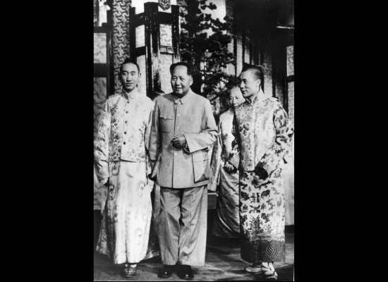 In this 1956 picture the two spiritual leaders of Tibet, the rival Panchen (L) and Dalai Lamas (R), are shown flanking their 'protector', Mao Zedong, Chairman of the People's Republic of China, in Beijing. Communist China announced 28 March 1959 that it had deposed the Dalai Lama and set up a new government in rebellious Tibet under the Panchen Lama. The late Panchen Lama (1938-89), a spiritual leader and teacher in Tibetan Buddhism (second in importance to the Dalai Lama), was said to be reincarnation of the Buddha Amitabha. He became the ward of the Chinese in his childhood, and some Tibetans disputed his status. Dalai Lama or Tenzin Gyatso, born in 1935, is the traditional religious and temporal head of Tibet's Buddhist clergy . In March 1959, there was an unsuccessful armed uprising by Tibetans against Chinese rule. As a result, the Dalai Lama, fled with some 100,000 supporters to northern India, where a government-in-exile was established. The Chinese ended the the former dominance of the lamas (Buddhist monks) and destroyed many monasteries. Tibet (Xizang), occupied in 1950 by Chinese Communist forces, became an 'Autonomous Region' of China in September 1965, but the majority of Tibetans have continued to regard the Dalai Lama as their 'god-king' and to resent the Chinese presence, leading to intermittent unrest. (Photo credit should read -/AFP/Getty Images)