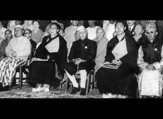 From left: Maharajah of Sikkim, Dalai Lama (or Tenzin Gyatso, born in 1935), traditional religious and temporal head of Tibet's Buddhist clergy, Jawaharlal Pandit Nehru, Indian Prime Minister, Panchem Ngoerhtehni Lama and U Nu, the former Prime Minister of Burma are seated 26 November 1956 in New Delhi during a Symposium on Buddhism's contribution to Art, Letters and Philosophy. (Photo credit should read -/AFP/Getty Images)