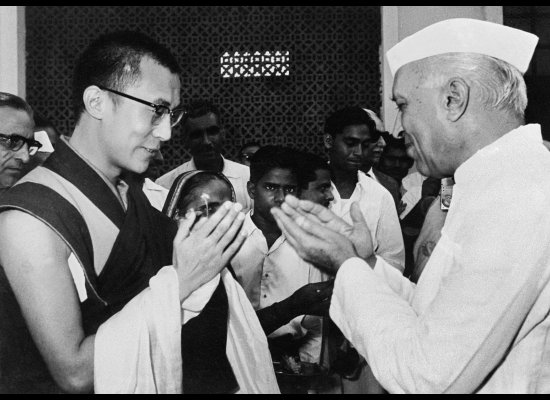 NEW DELHI, INDIA - JANUARY 1: Picture taken from the 60s of Indian prime minister Pandit Jawaharlal Nehru (R) and Dalan Lama in Buddhist salutation. Indian statesman and prime minister (1947-64) Nehru joined the Indian Congress Committee in 1918, he was influenced by Gandhi and was imprisoned several times by the British. In 1947 he became India's first prime minister and minister of external affairs. N/B B/W (Photo credit should read STAFF/AFP/Getty Images)