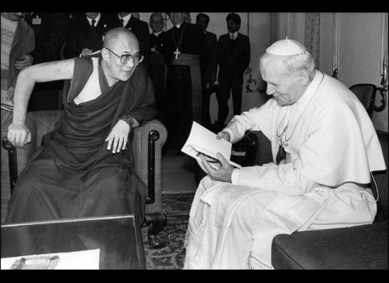 Pope John Paul II in a picture taken 02 February 1986 in New Delhi checks a book entitled 'Opening The Eye Of New Awareness', the last book written by Dalai Lama (l), Spiritual Chief of Tibetan Budhists, during Pope's ten-day visit to India. AFP PHOTO (Photo credit should read VATICAN POOL/AFP/Getty Images)