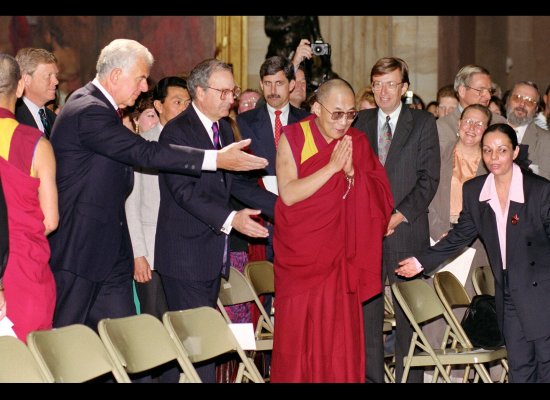 WASHINGTON, DC - APRIL 18: The Dalai Lama (C) is ushered into the Rotunda of the US Capitol, 18 April 1991, by the Speaker of the House Tom Foley (L) and Senate Majority Leader George Mitchell (2ndL). The Dalai Lama addressed members of the US House of Representatives and Senate. (Photo credit should read JENNIFER LAW/AFP/Getty Images)